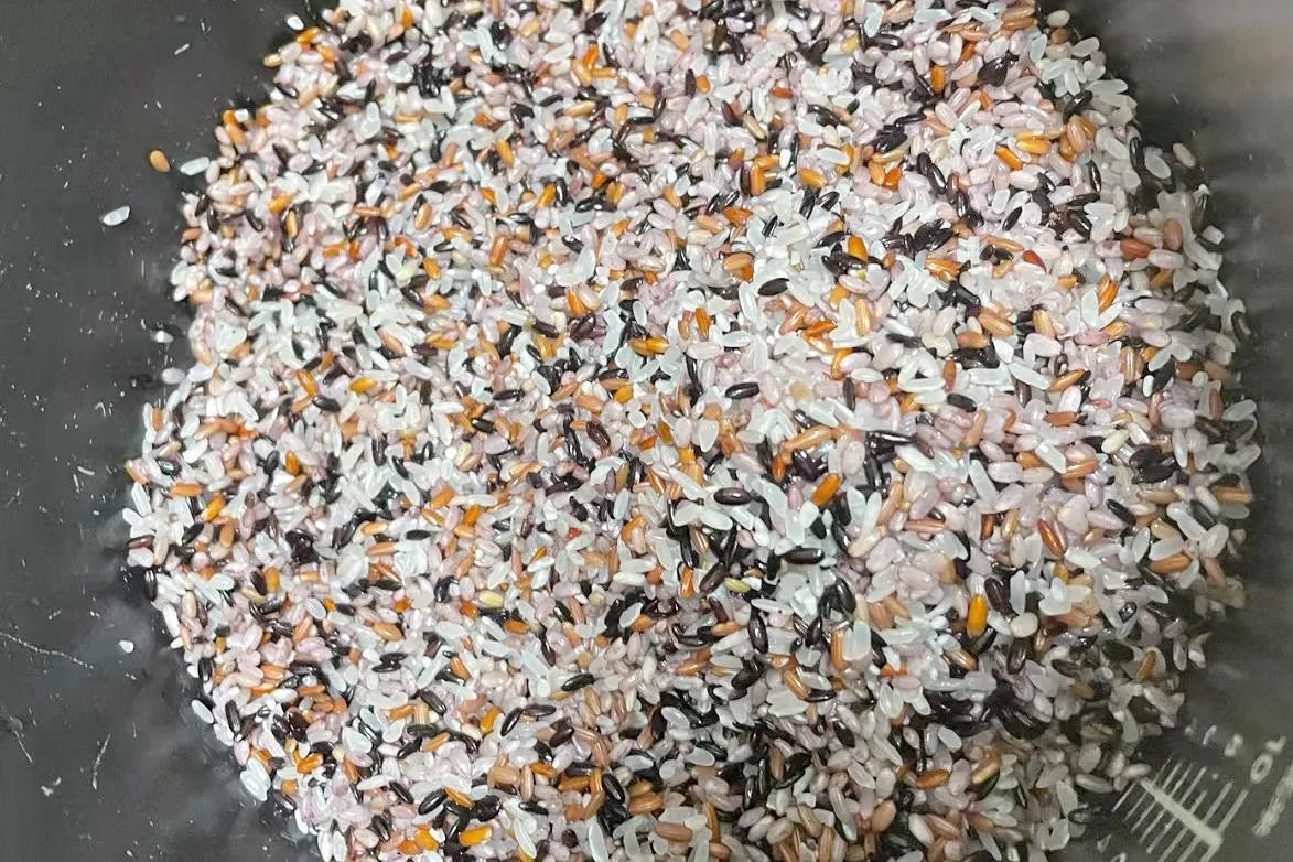 1、准备适量三色糙米,和大米按照1:1的比例放入锅中,冲洗几遍,洗干净;