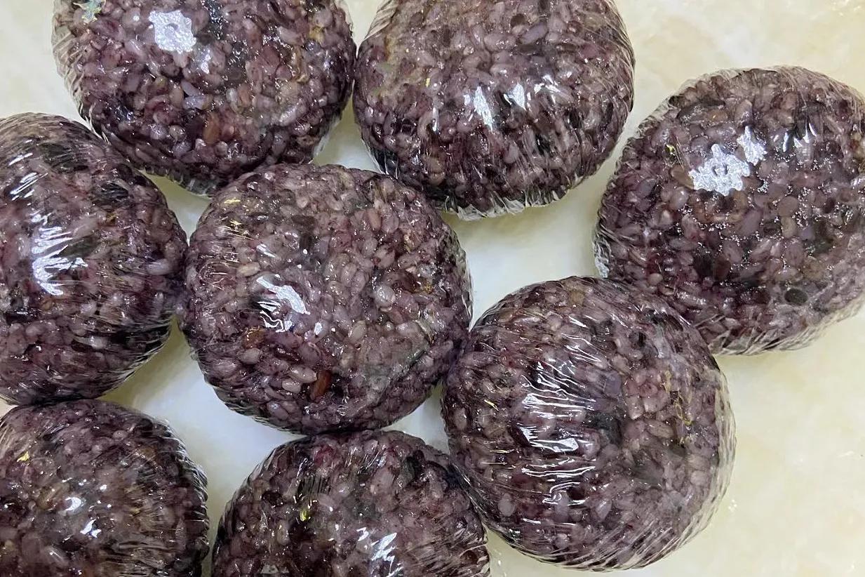 3、煮好的杂粮饭,将其放凉后,戴上手套搓成跟拳头差不多大小的饭团,再用保鲜膜包裹起来,放入冰箱中冷冻,吃之前再拿出来加热即可。