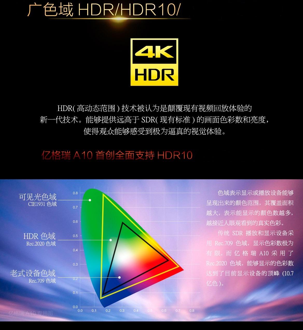 亿格瑞A10支持HDR/HDR10全模式HDR,并可设置最佳的色彩空间和色深模式,使用户能够完美体验到原汁原味的高清画质。