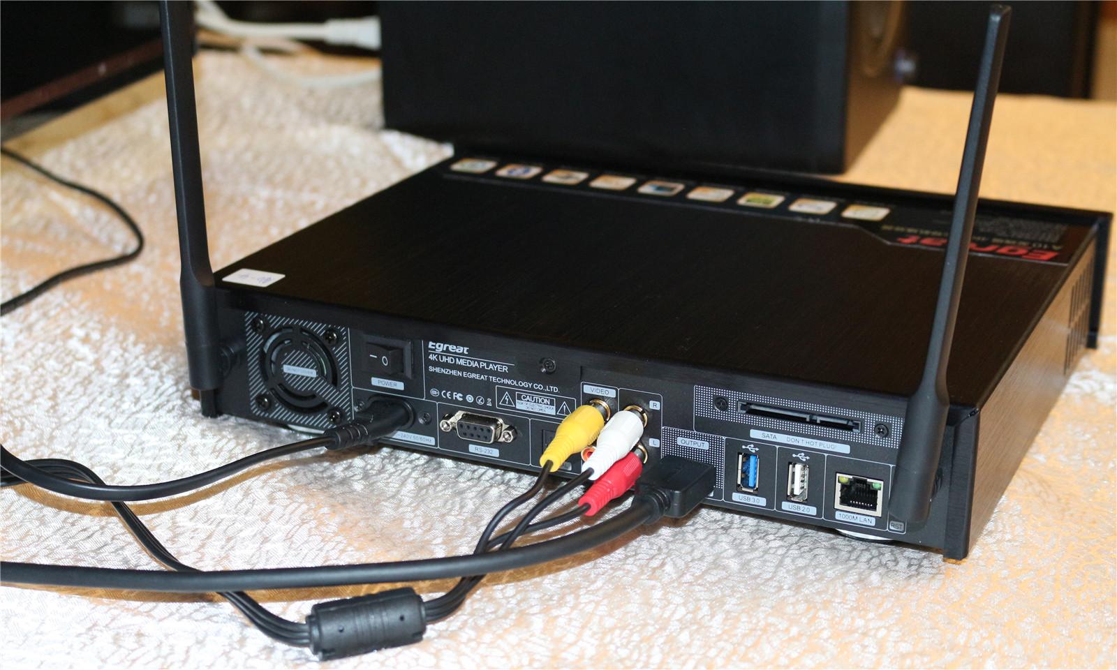 亿格瑞A10 背部拥有丰富的接口:复合视频输出、立体声音输出、RS-232接口、光线同轴音频输出、HDMI输出、USB3.0接口、外部SATA接口、有限网络接口、USB3.0/2.0接口,无论是内部还是外部都优于传统电视盒子,让高清播放器可玩性更高。