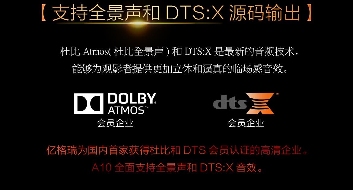 另一方面亿格瑞A10全面支持全景声和DTS:X音效,能够为用户提供更加立体和逼真的身临其境的震撼音效。