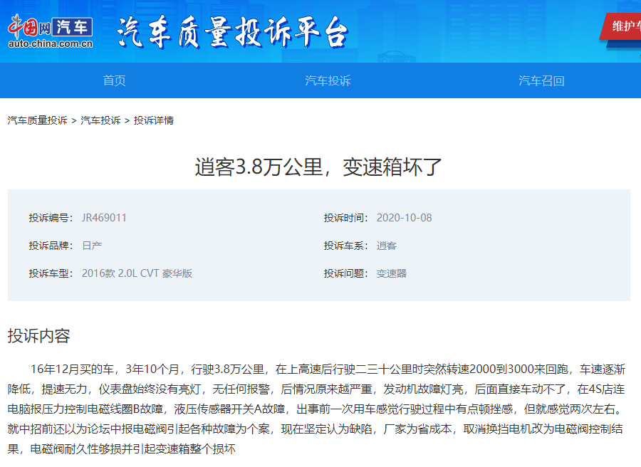 中国网汽车10月16日讯 近日,中国网汽车质量投诉平台(我要投诉:http://315.auto.china.com.cn/zlts/complain-add.html)收到一个来自何先生关于日产逍客因CVT变速箱故障导致