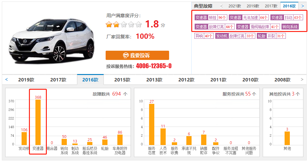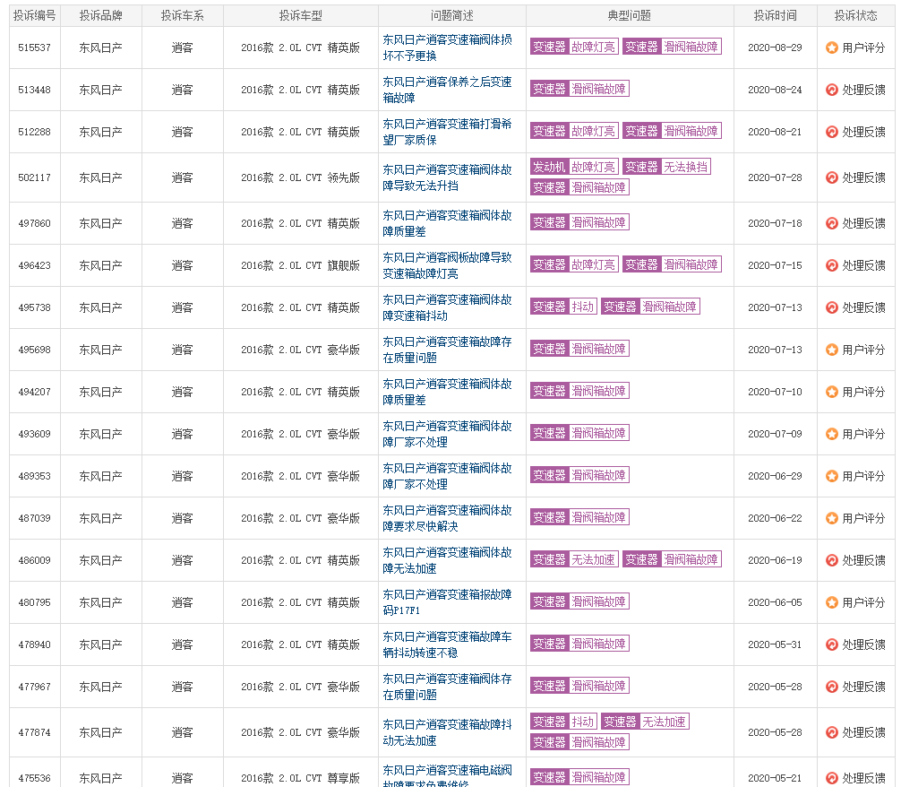 另外记者通过查阅车质网投诉平台也了解到,关于日产逍客因CVT变速箱故障导致无法加速的投诉并不在少数,2016款车型存在大量该故障的投诉,而且有很多车主都在4S店检测出变速箱故障码P0776(变速箱压力控制电磁线圈B)、故障码P17F0(CVT颤动)等故障码,都有踩油门无法提速的情况发生。