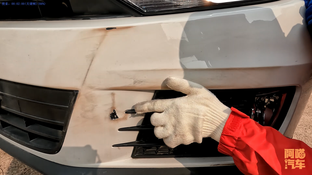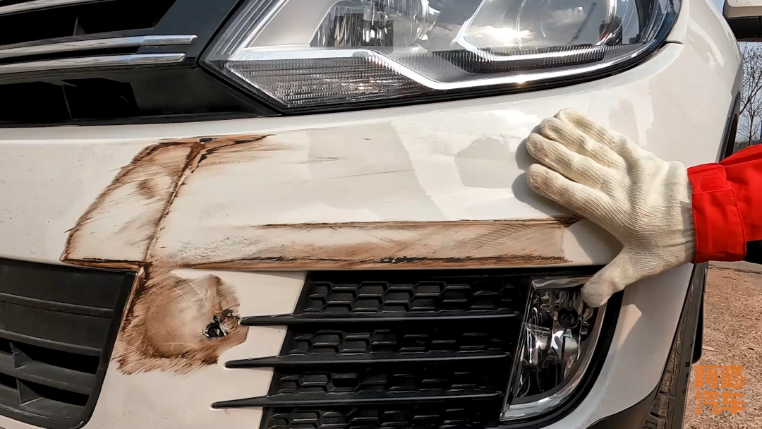 这种其实抛光一下,这个地方稍微补一下就可以了,完全没有必要去做整面的油漆。然后我们多用几遍柏油清洗剂让它作用一下,那些脏东西全部擦掉之后,我们发现这个小的破洞有一块油漆蹭掉了,其他地方完全都是完好的。你不是纯粹的完美主义者的话,这个保险杠我们就只要补一点油漆就可以了。