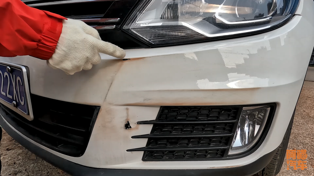 而且你也不会每天对着破洞去看对不对,经过柏油清洗剂清洗之后,近看保险杠上面有印子的地方还是比较明显,蹭掉这一块漆的地方也要明显一点,其它地方会有一点点的印子,这些印子跟白色的油漆有点不一样,光靠柏油清洗剂是去不掉的,但是我们只要用车蜡抛光一下,基本上可以把它抛掉,这个破洞用补土填一下,然后喷点漆补一下基本上就不那么明显了。