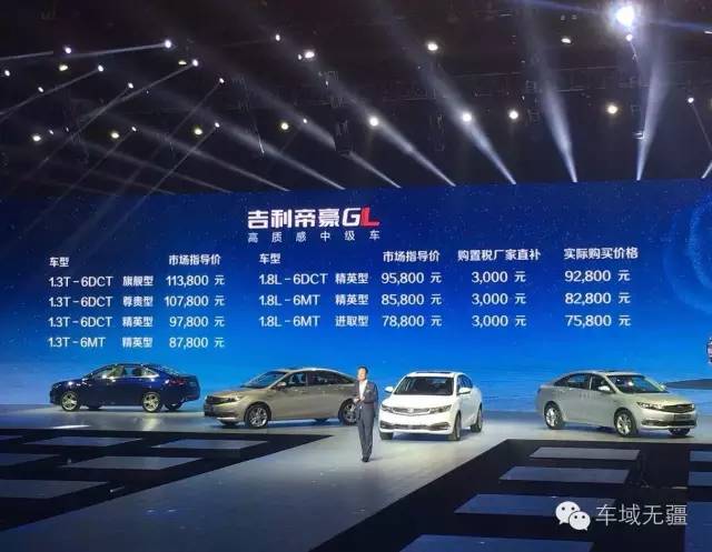 2016年9月20日,吉利汽车在G20峰会主会场杭州国际博览中心,官方正式宣布旗下全新帝豪GL正式上市,共推出包括1.8L/1.3T两种动力在内的7款车型,售价7.88-11.38万元。显然,