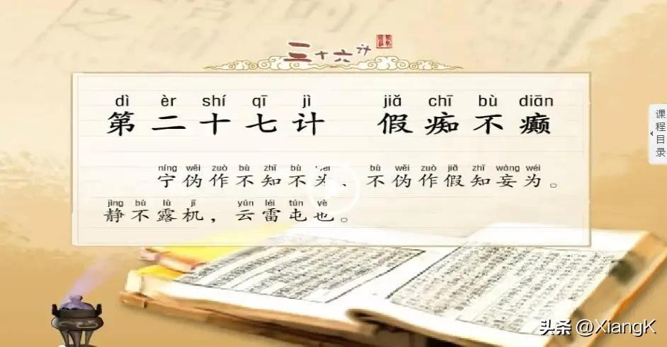 《三十六计》中第二十七计,指假装痴呆,掩人耳目,另有所图。《三十六计》或称“三十六策”,是指中国古代三十六个兵法策略,语源于南北朝,成书于明清。它是根据我国古代卓越的军事思想和丰富的斗争经验总结而成的兵书,是中华民族悠久文化遗产之一。