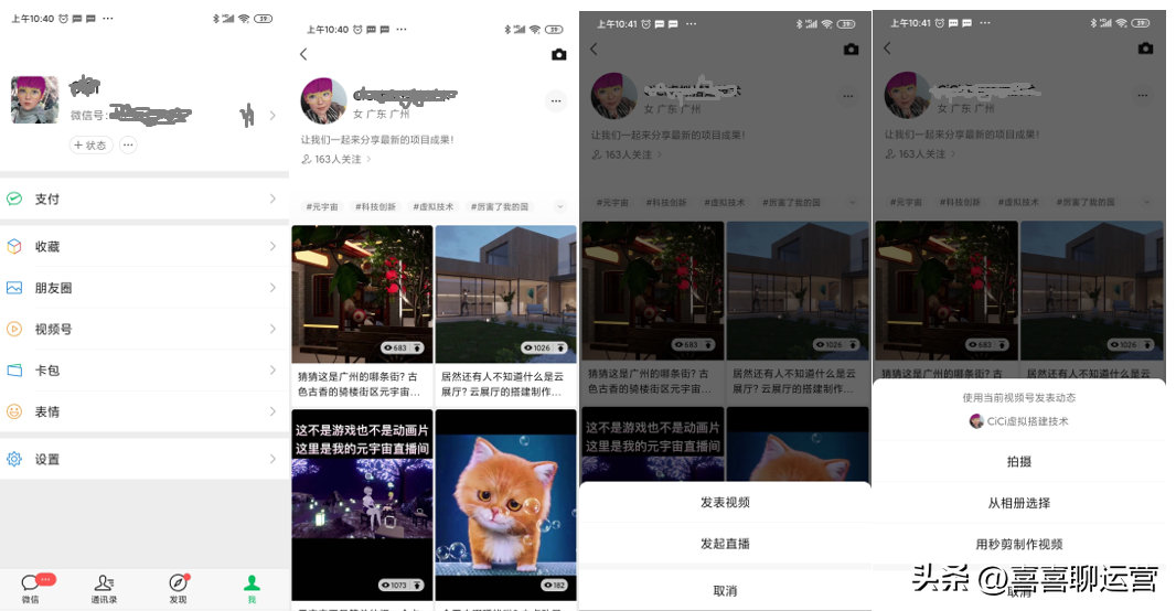 打开微信点击“我”-点击由上角的“”-选择“发表视频”-“从相册选择”挑选你已经剪辑好的作品。