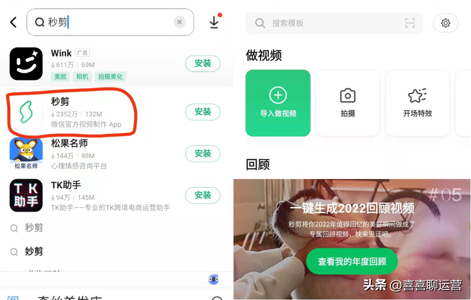 手机应用市场下载“秒剪”App。打开App,按拍摄进行视频拍摄,或者按“+”从相册导入已拍摄的素材开始做视频。