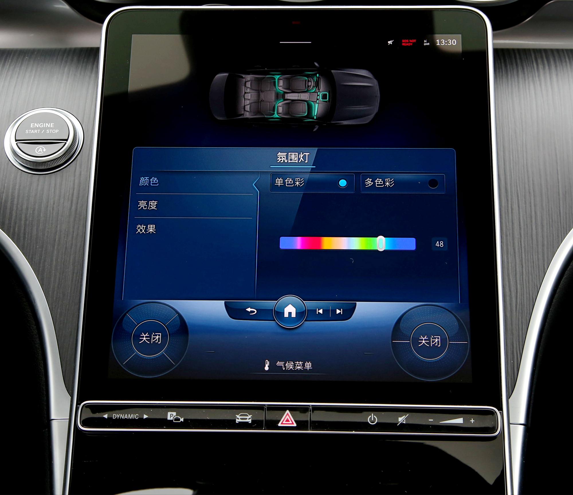 全系车内标配64色氛围灯,晚上点亮之后非常炫酷。