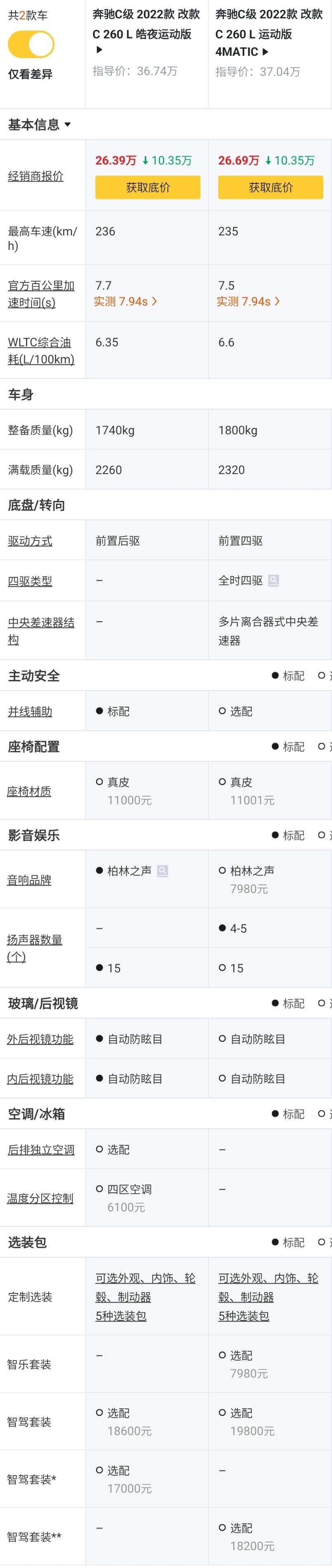 260 L 运动版 4MATIC对比260 L 皓夜运动版,价格+0.3万元,前置后驱升级为全时四驱,少了并线辅助功能,少了带15个扬声器的柏林之声音响,内后视镜从自动防眩目降级为手动防眩目。个人不建议升级,虽然四驱动力表现更好,但少了柏林之声音响,不太值。