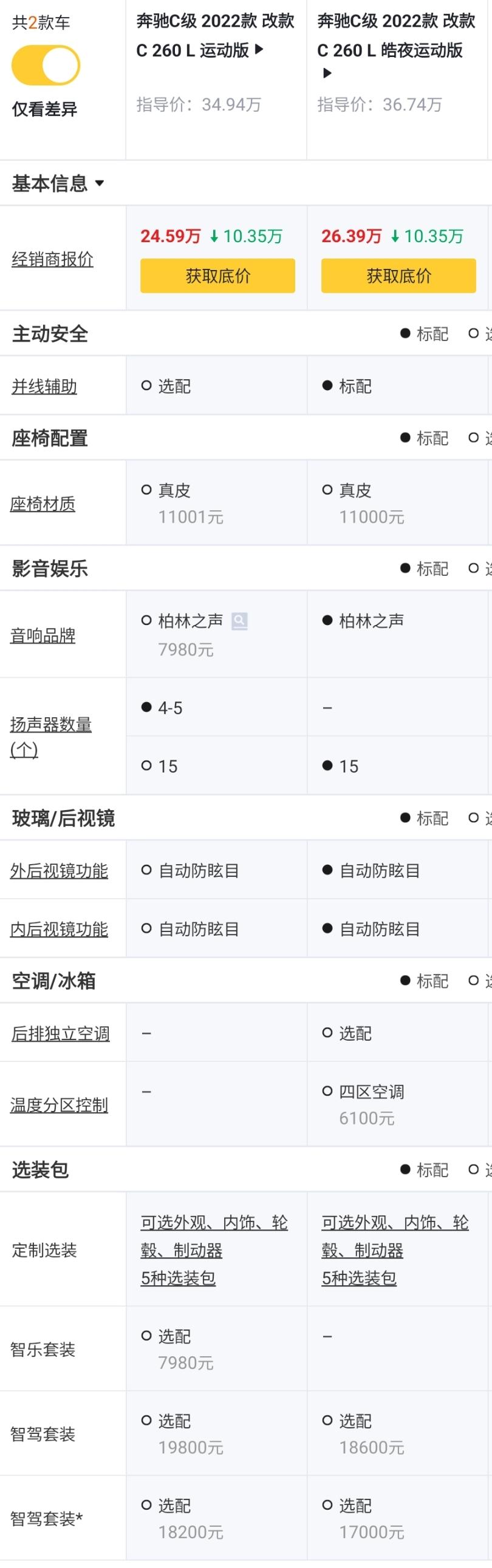 其次,260 L 运动版对比260 L,价格一样,但多了运动外观套件,颜值更高,排除260L;而260 L 皓夜运动版对比260 L 运动版,价格贵了1.8万元,但多了并线辅助和柏林之声音响,可以显著提高用车舒适性,此外还多了夜色套装,更显运动感,因此排除260 L 运动版;
