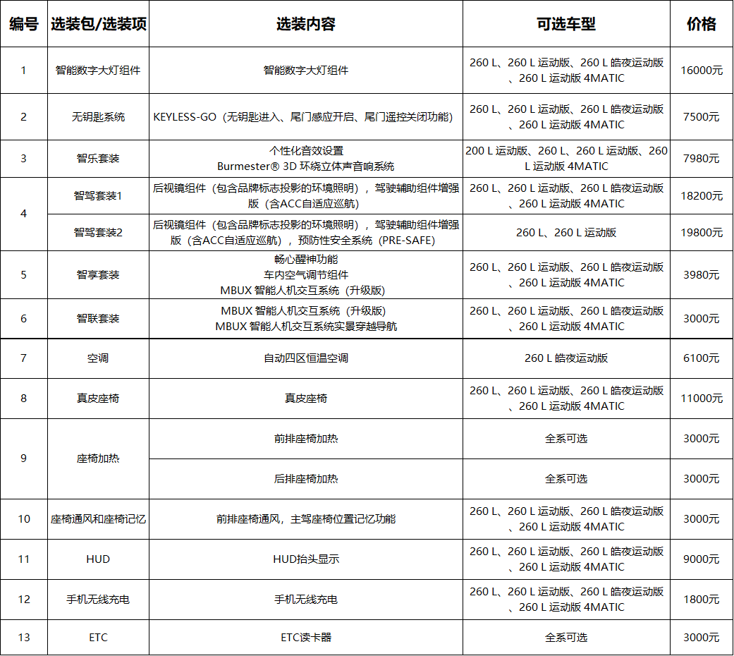 最后,260 L 运动版 4MATIC对比260 L 皓夜运动版,价格贵了0.3万元,虽然前置后驱升级为全时四驱,但少了并线辅助和柏林之声音响,不太值,排除260 L 运动版 4MATIC,因此最终建议选择260 L 皓夜运动版。