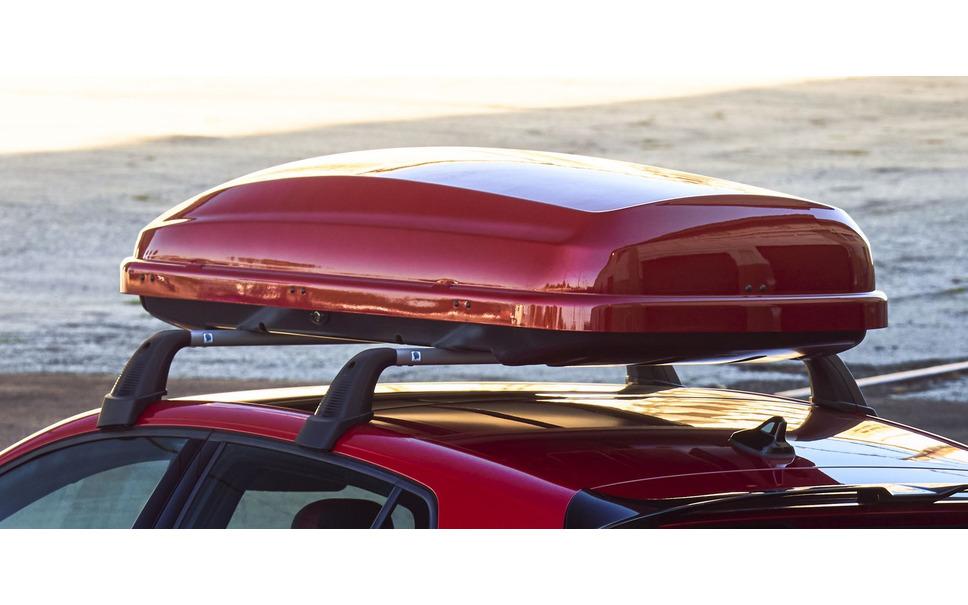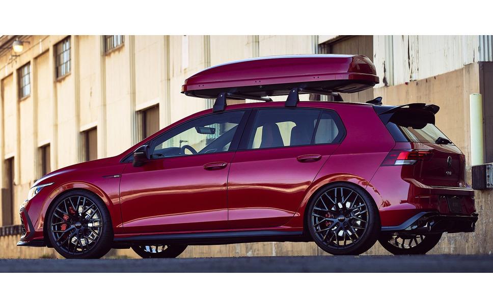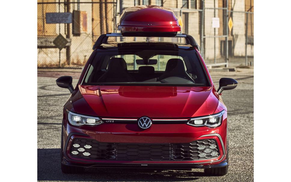 与车身颜色相同的红色车顶箱被添加到基础承载杆上。大众汽车原厂配件包括 GTI 动态中心轮毂盖、动态转向信号灯、黑色后保险杠保护装置、带 Homelink Connect 的后视镜和 Monstermat 四季地板垫。