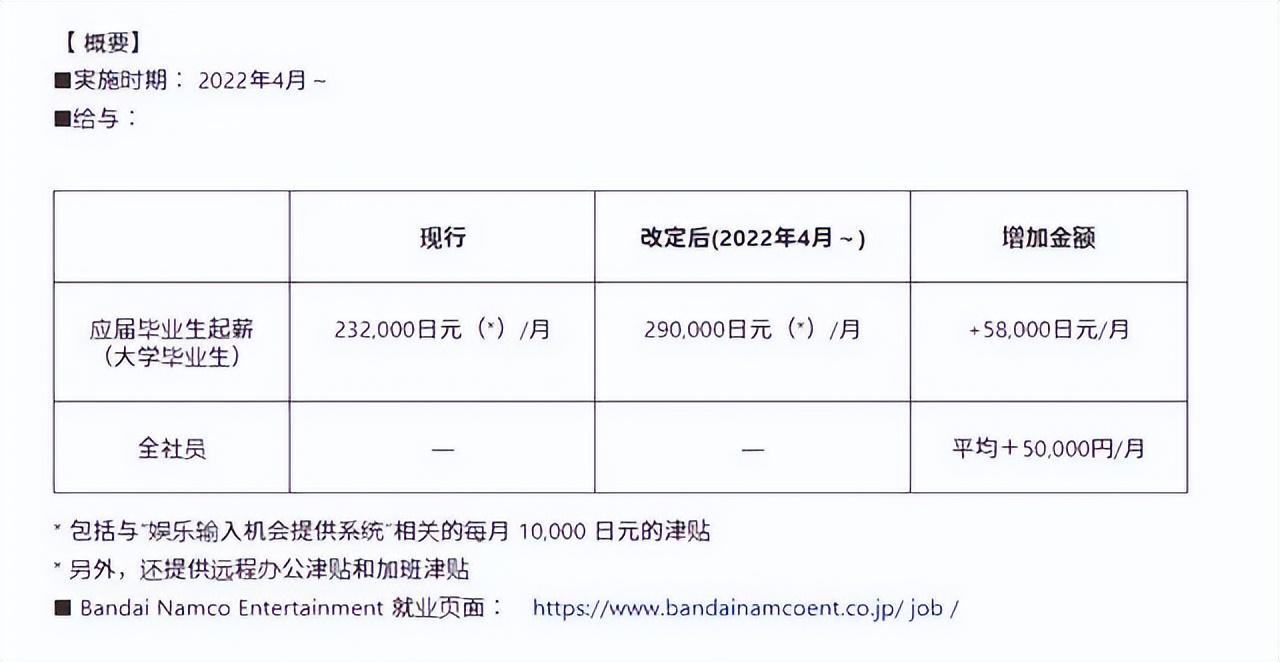 这也是今年4月,万代同期启动的中期计划是“Connect with Fans”的原因。早在2月28日,万代还为了实现这一中期愿景,引入了新的薪酬制度,普调了所有员工的工资,正式员工的基本工资平均每月上调5万日元(约合2576元人民币),面向应届生的起薪,也从原先的23.2万日元,提高了5.8万日元,至29万日元(约合1.5万元人民币)。