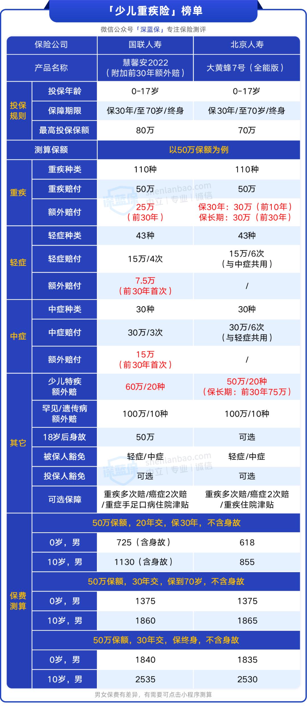 但保30年时,相比「慧馨安2022」就逊色了一点——少儿特疾额外赔100%,重疾只有前10年能额外赔60%。