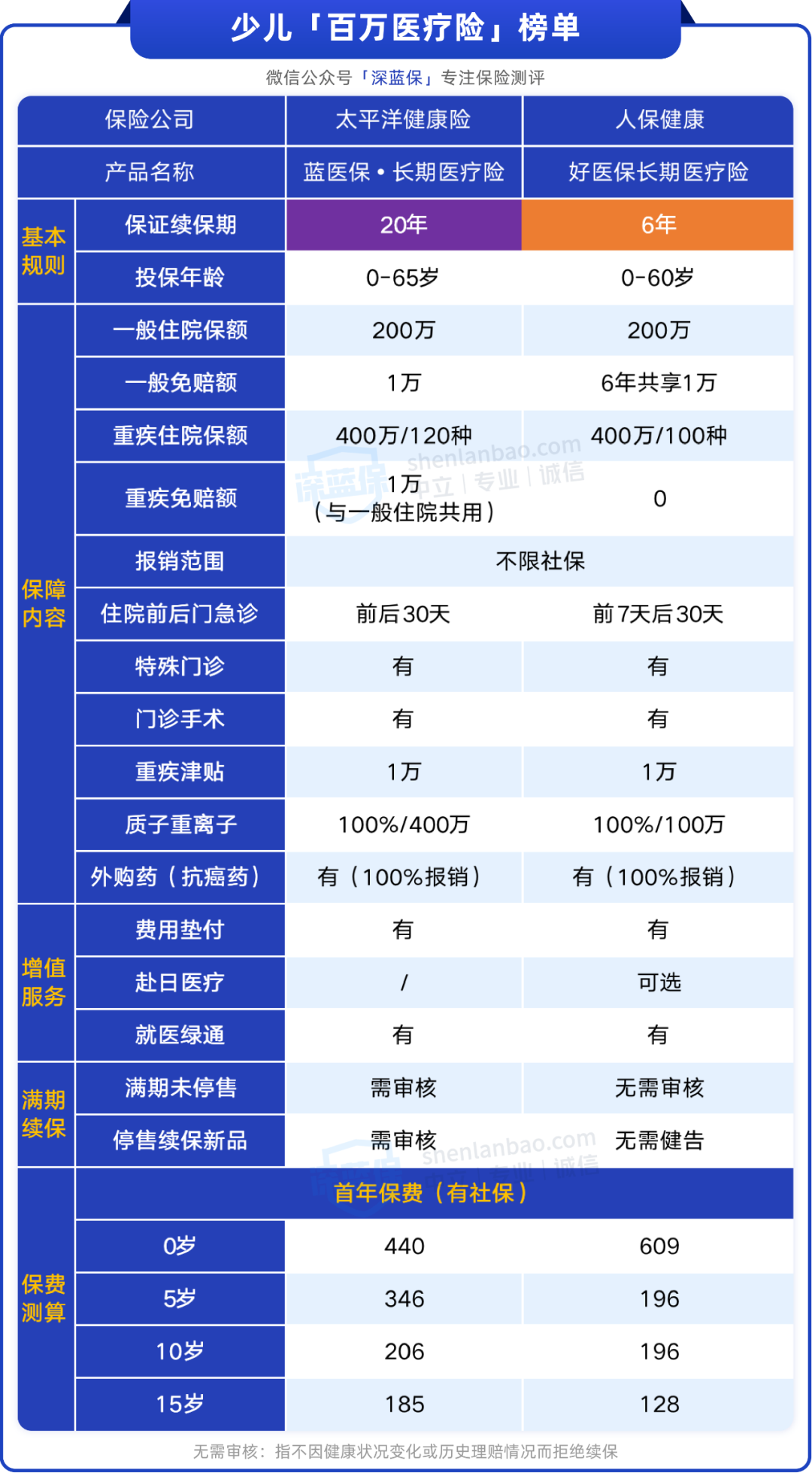 蓝医保·长期医疗险由太平洋健康险承保,是目前市场上非常热门的百万医疗险之一, 能够保证续保20年 。给孩子买的话,这款产品可以作为首选。