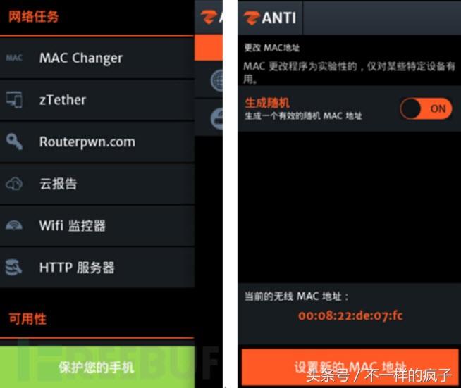 该工具是由以色列移动安全公司Zimperium开发的。此外,它能够支持一系列的网络任务:MAC变更、zther(对欺骗的手机端实现了记录请求、记录图像、zpacketEditor、SSL strip、重新导向HTTP、替代图片、获取下载、截获下载、插入HTML等一系列强大的功能。)routerpwn.com、云报告、WIF监控器、HTTP服务器等一系列使用功能。此外还提供了可用性指导,诸如教程、基本信息、设置、设置语言,重点是支持中文)。本次重大更新