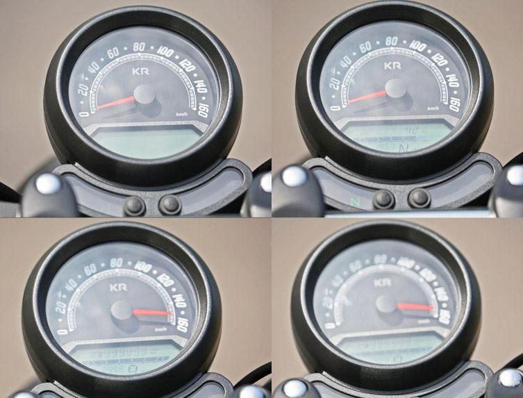 前三张是仪表的三个状态,最后一张是仪表下方的ABS、空挡、远光、左右转向指示灯及调节按键。由于用户对档显的需求,档显都被设计的很显眼;燃油存量、时间、单程、总里程都被收纳在内。时速的显示最为巨大,KR英文被放在正中间。仪表的风格和布局,非常传统。