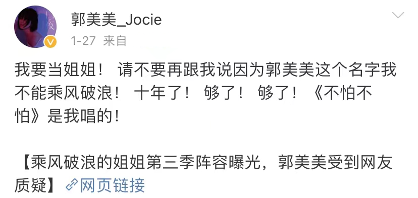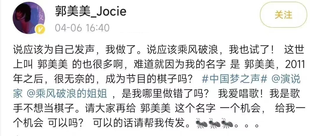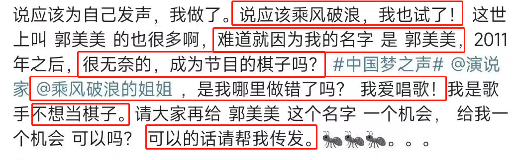 在文字最后,郭美美直接点名《浪姐3》节目组,并且苦求内地节目组可以给自己一个机会,表示自己只想唱歌,不想再被当作棋子利用。同时请求网友帮忙转发,支持自己。