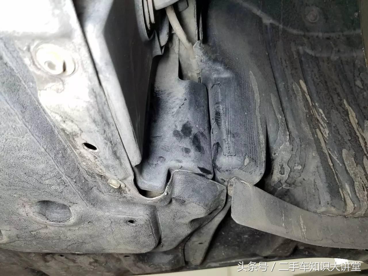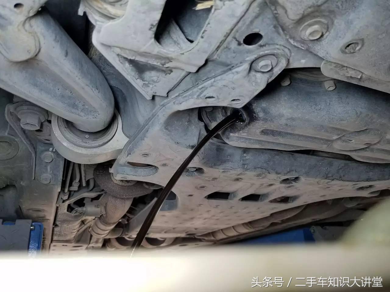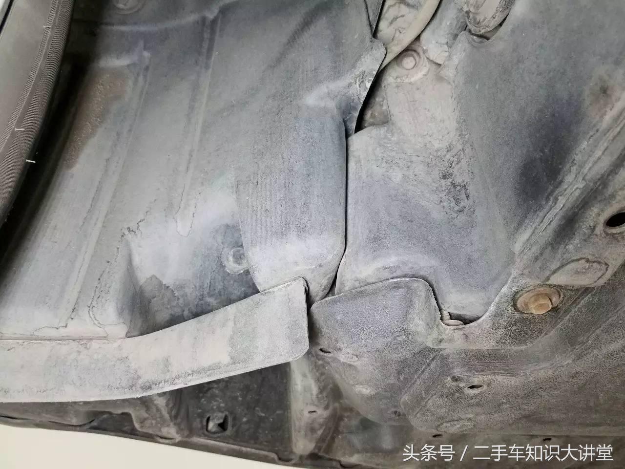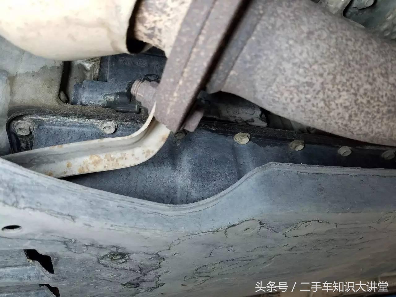 逐项检查完毕之后,发现油底壳上稍微有点渗出,但程度非常轻微。两个避震器上有一层油泥,毕竟是易损件,10年下来确实也该寿终正寝了。