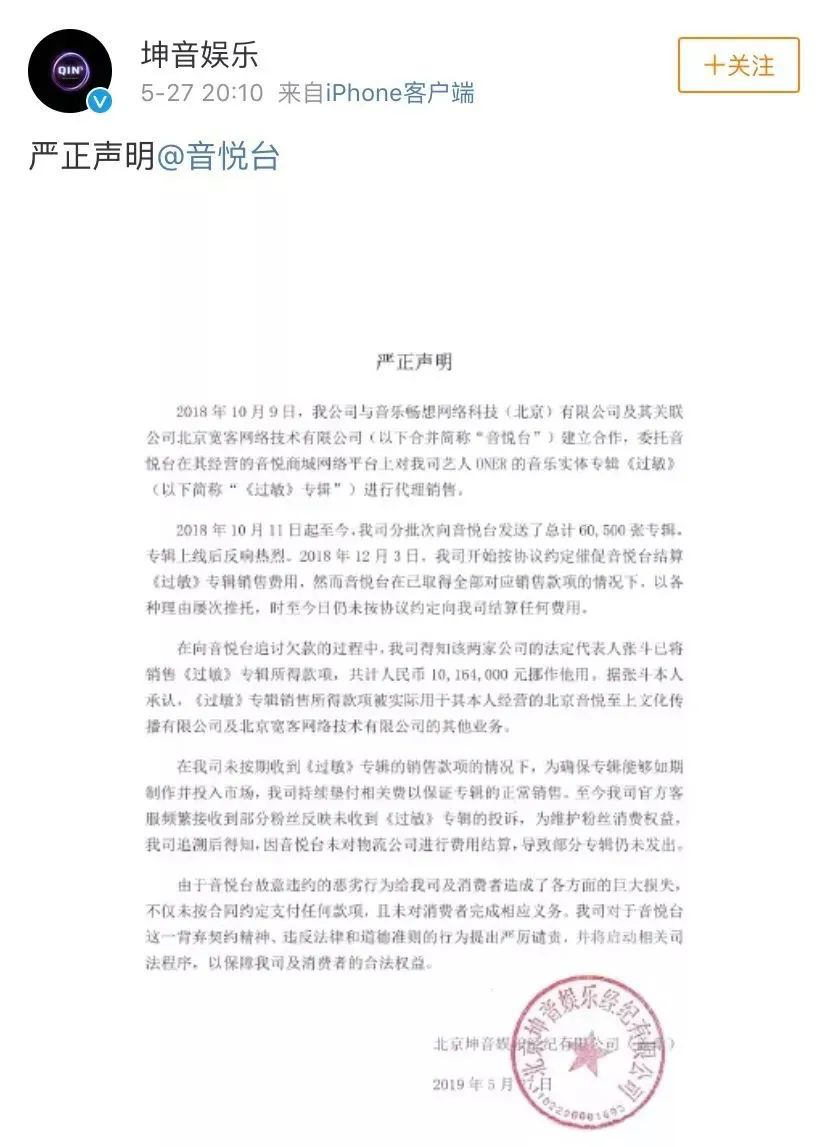 2019年5月,坤音娱乐官方微博发布声明,称音悦台擅自将售卖旗下艺人ONER的音乐实体专辑《过敏》所得款项用于他用,要求其偿还欠款。一时之间,ONER粉丝在张斗微博下围堵,声讨还款。