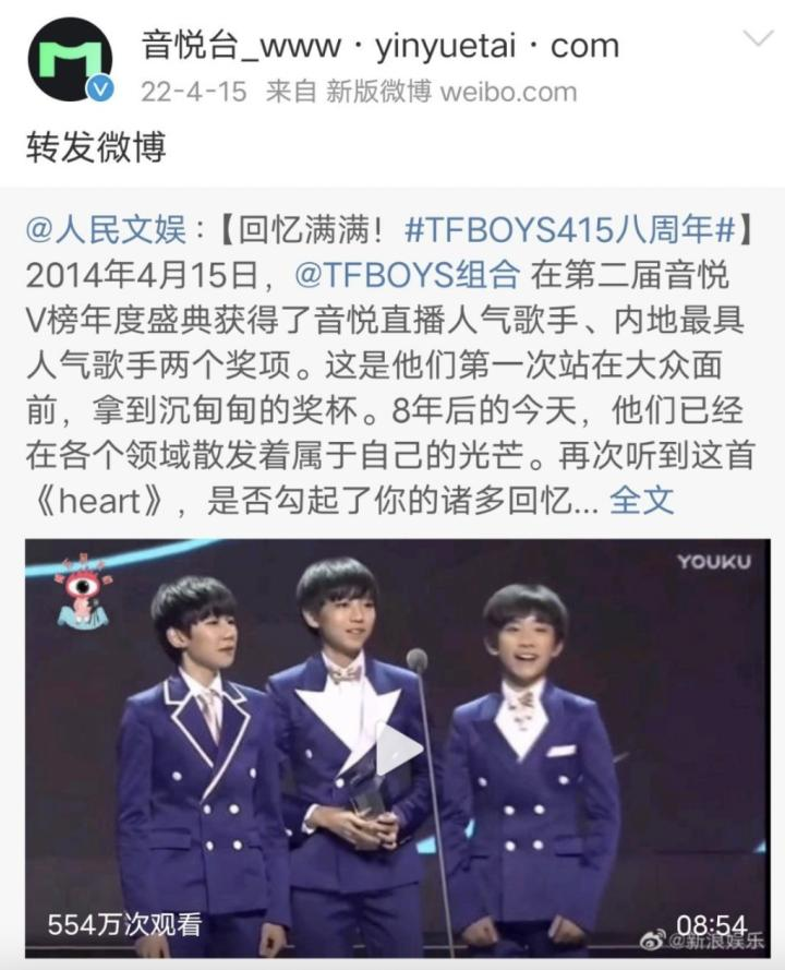 2014年,TFboys在“音悦V榜年度盛典”打败EXO、CNBLUE等热门韩流组合拿到音悦直播人气歌手、内地最具人气歌手奖,这也是他们第一次站在大众面前。