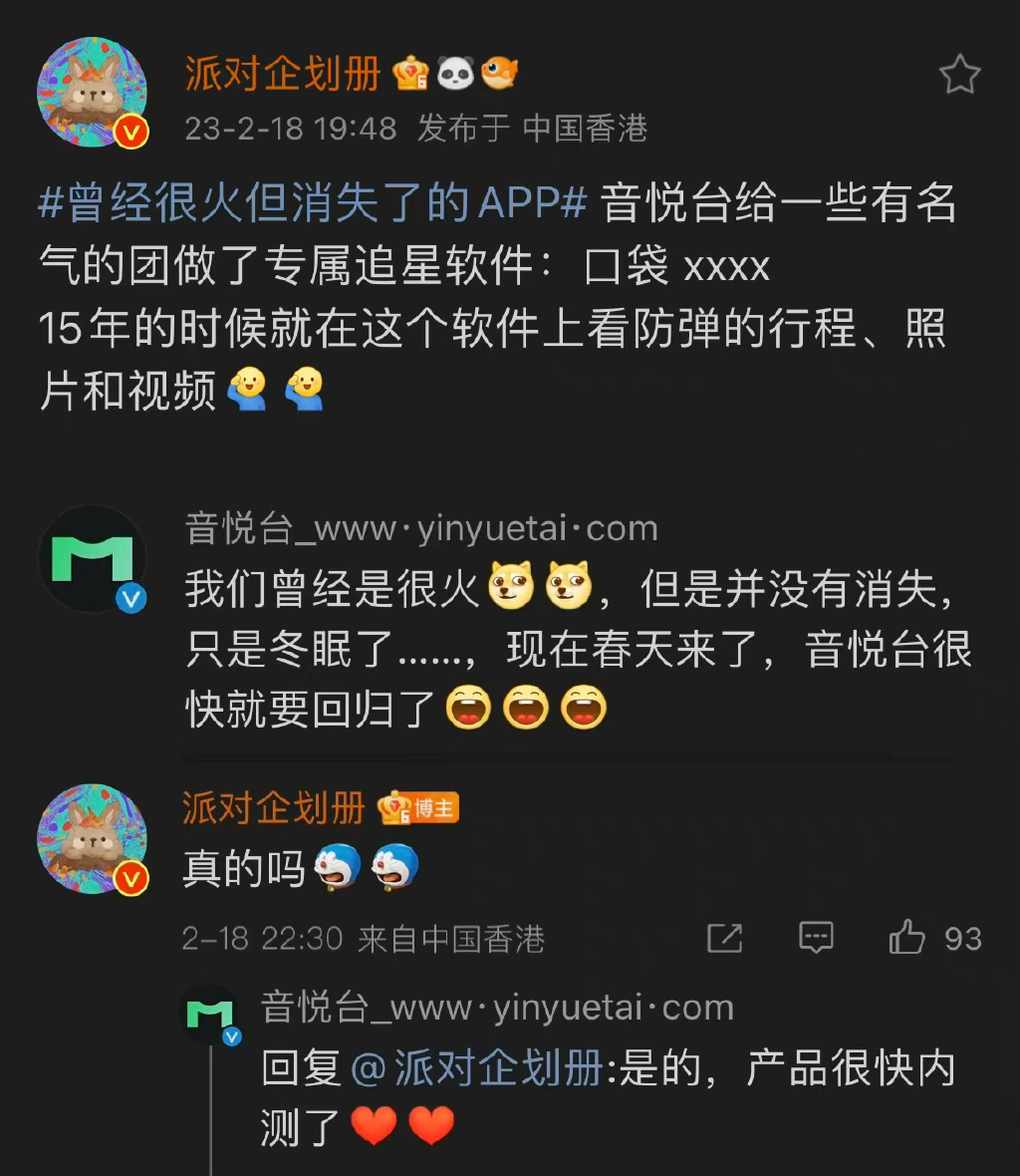 2月18日,销声匿迹近四年的音悦台,在一条微博评论区突然透露他即将回归的消息,还称“产品即将内测”,预示不久可能便会上线。