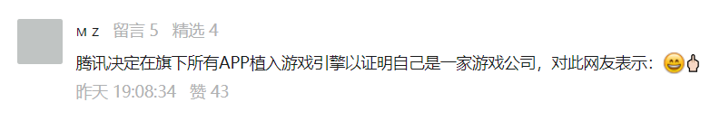 以至于粉丝给我留言对鹅厂实力嘲讽:“腾讯决定在旗下所有APP植入游戏引擎,以证明自己其实是一家游戏公司。”