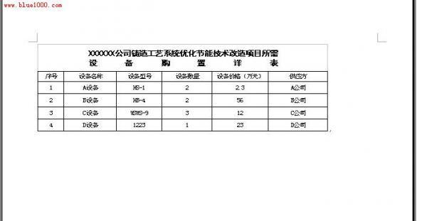 8.如果需要将此表插入到word文档以便其他使用,也很简单。先将刚做好的Excel表格保存为一个文件名《设备表》到桌面上。将此页的页面 设置成横 向,否则表格会显示不全的。在Word文档中需要插入的地方,点击一下鼠标,然后选择上面“插入”---“对象”——“由文件创建”,然后找到刚刚保存的 《设备表》,插入,确定,然后就插入到Word中了。效果图如下: