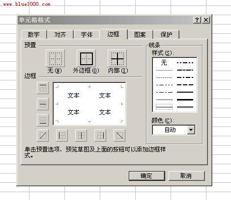 3.在新建excel中,用鼠标选中需要的表格行数列数,然后点右键,“设置单元格格式”——“边框”,在“预置”中根据需要选择“外边框”、“内部”边框。