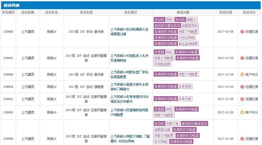 师哥从车质网投诉平台上了解到,荣威i6在11月份出现的"同款不同配"投诉就已经高达了215宗,12月份更是呈现不断增长的上升趋势。