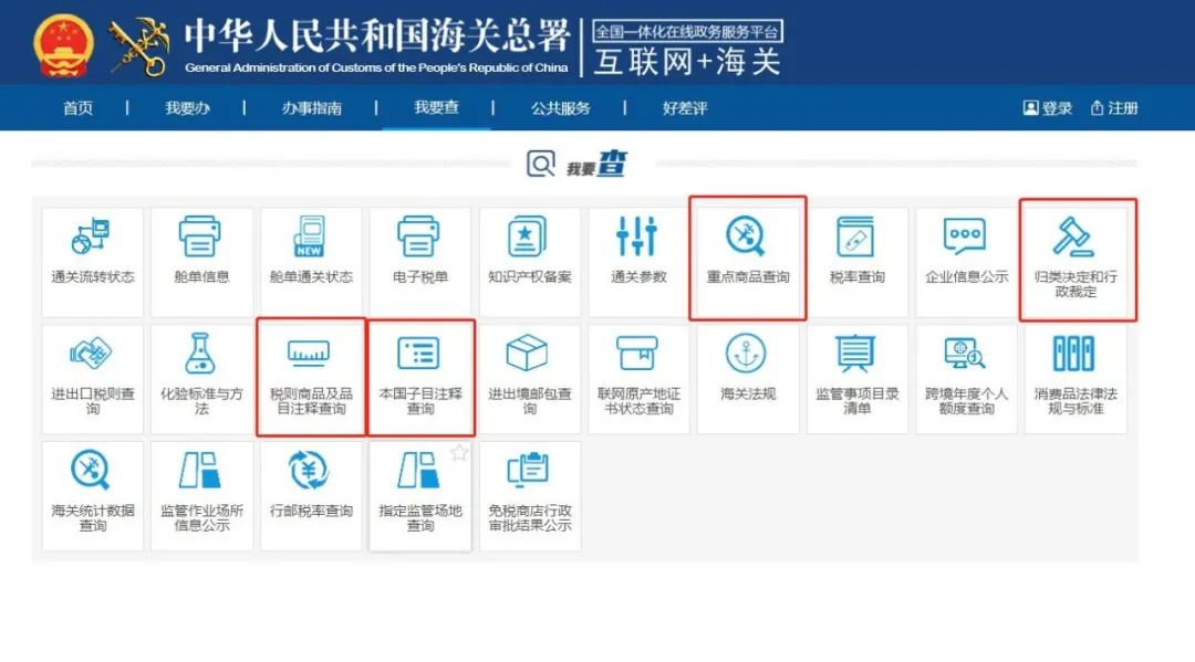 “互联网+海关”全国一体化在线政务服务平台“我要查”页面(复制以下链接通过浏览器打开:http://online.customs.gov.cn/static/pages/mySearch.html),查看税目税号、税则注释、本国子目注释、归类决定、归类预裁定、重点商品表等。