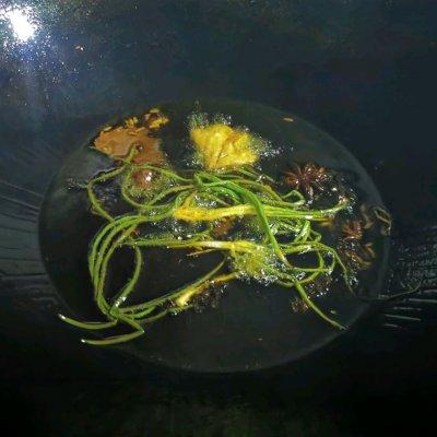2、锅里倒入菜籽油,油温3层热加入八角,和姜,花椒,慢慢加入将香味炸出来,油熟以后,小火加入葱,炸至变色捞出来