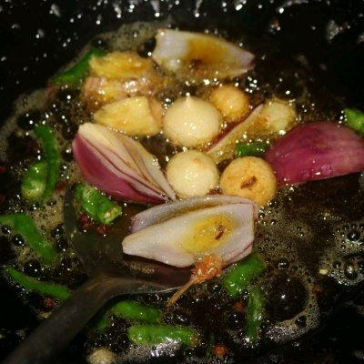 3、接着也是小火,加入洋葱,蒜,青椒,姜,花椒一起将料炒香。