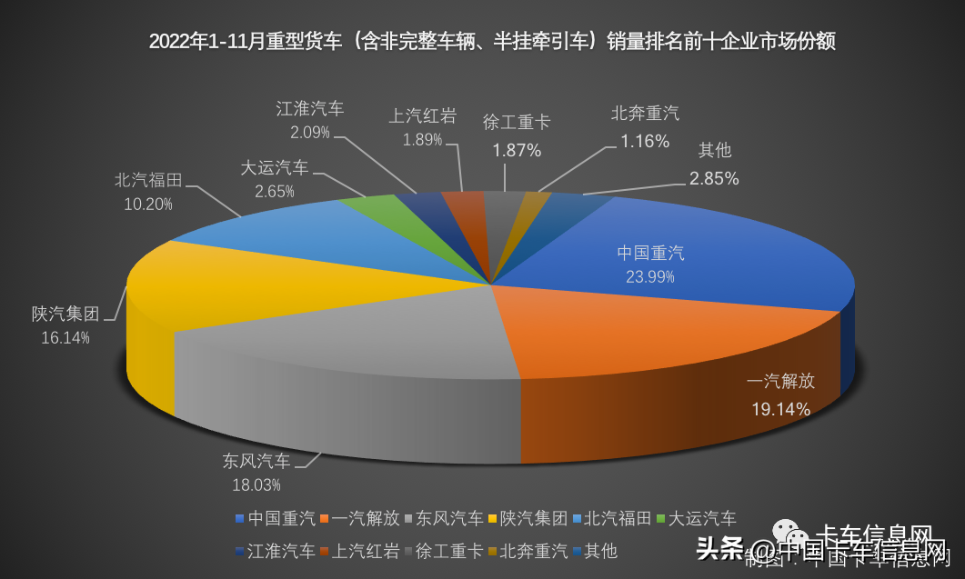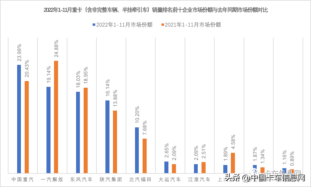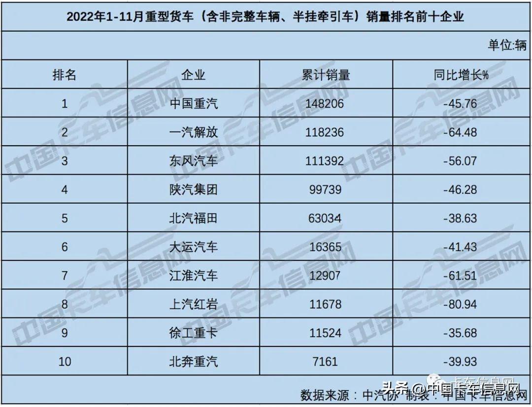 从同比来看,11月份,销量前十企业中同样有五家企业实现增长,分别是陕汽、解放、福田、江淮和北奔。