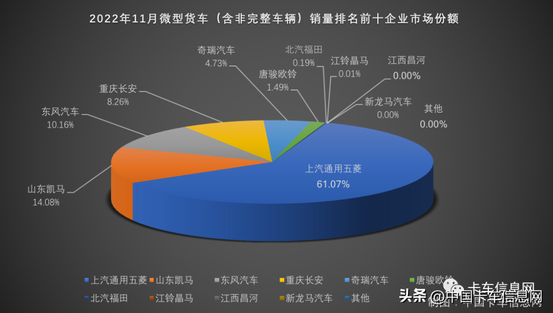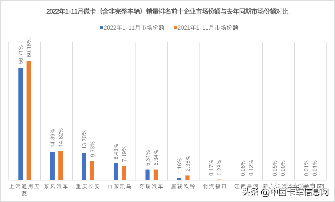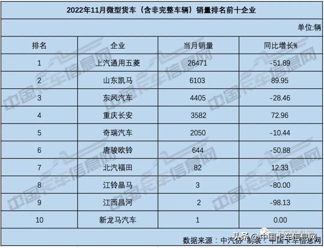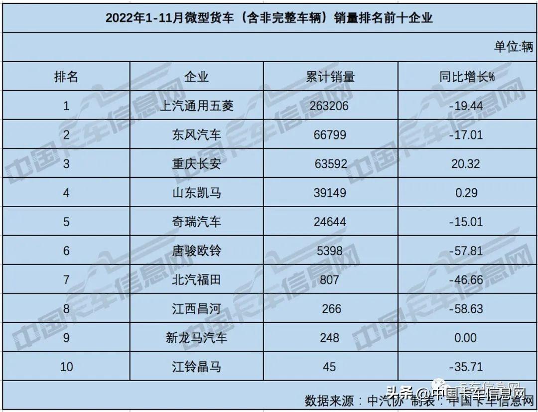 从同比来看,11月份,微卡市场销量前十企业中仅三家企业实现增长,分别是凯马、长安和福田。