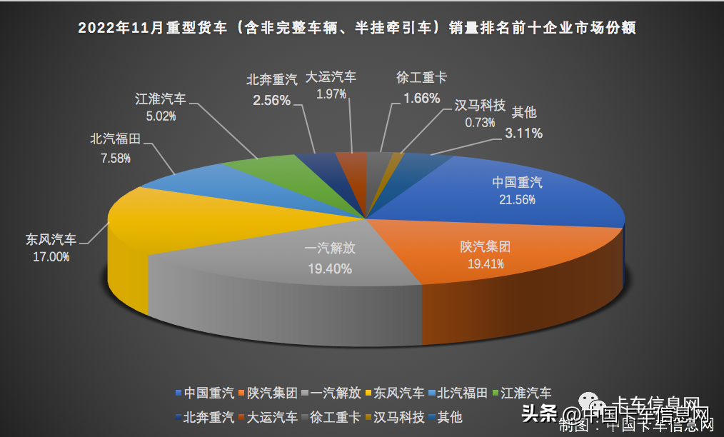 据中汽协发布的最新数据显示,2022年11月份,我国卡车市场(含底盘、牵引车)共计销售21.58万辆,环比10月份下降9.48%,同比下降25.61%,销量降幅较上月(-17%)有所扩大。那么,重中