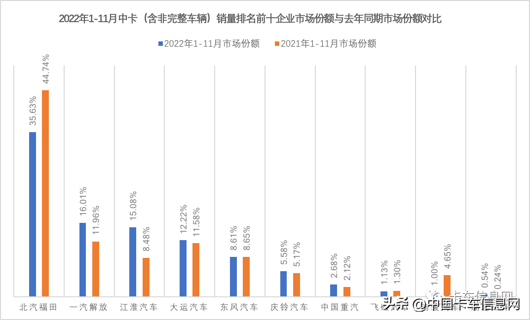从累计市场份额来看,累计销量前十企业合计份额达到98.48%。今年1-11月份销量排名前十企业市场份额与去年同期市场份额相比,解放、江淮、大运、庆铃、重汽、湖北三环六家企业实现增长。