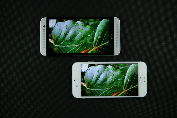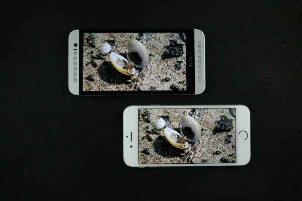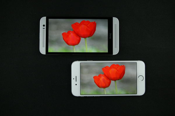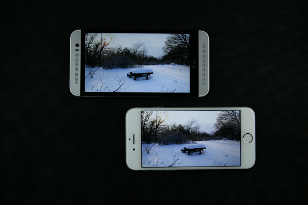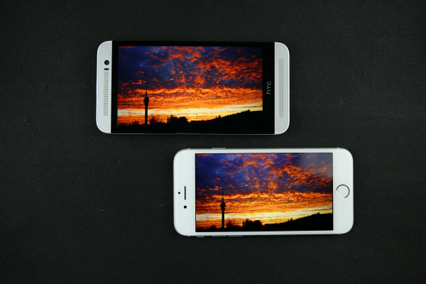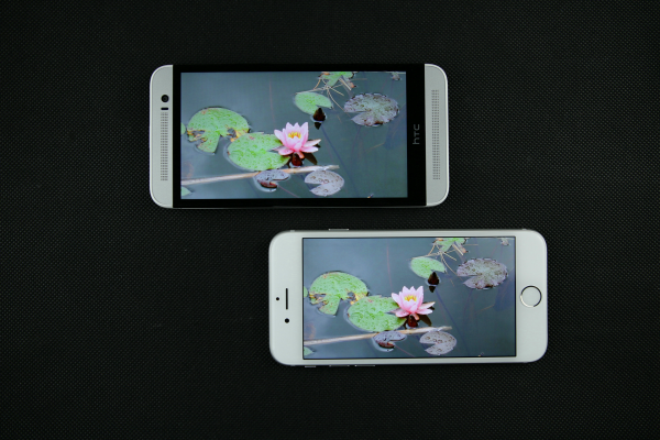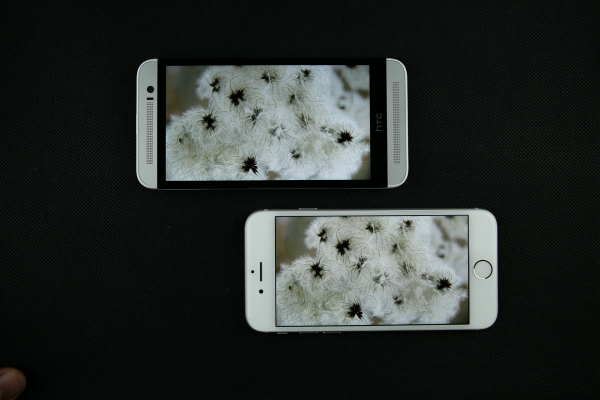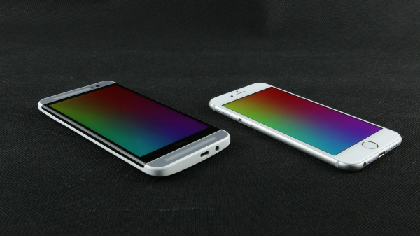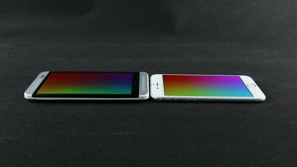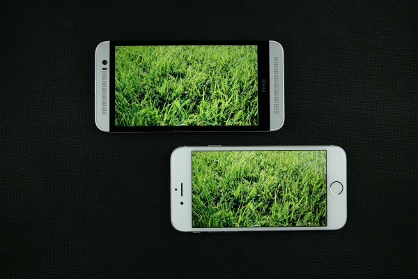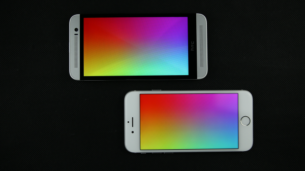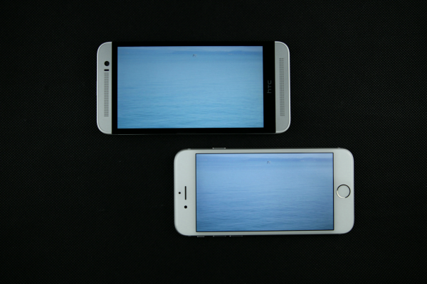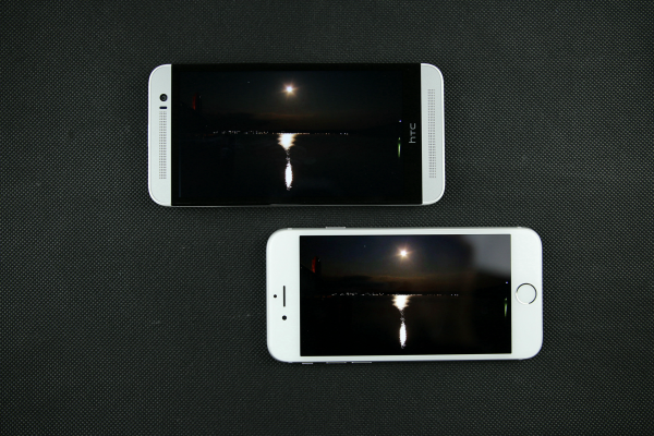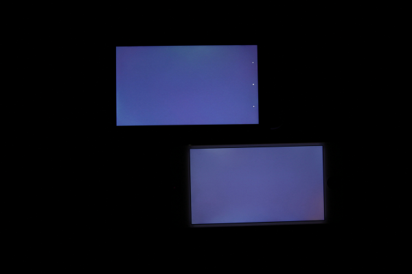 iPhone 6(右)屏幕背光均匀,没有明显的漏光现象,但在这个方面,用于对比的HTC M8S的表现却更好,但是毕竟iPhone 6的屏幕最大亮度比M8S的要大不少,所以显示纯黑色时M8S效果较优也是不出意料的。