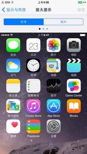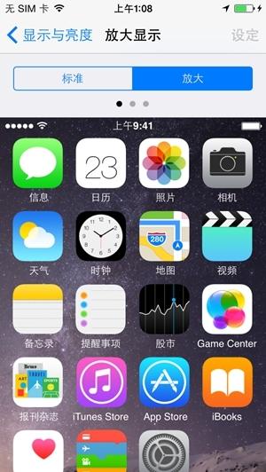 iPhone 6也能够选择主界面图标大小,选择小图标时,6的桌面布局为4×6+Dock,选择大图标时,桌面布局为4×5+Dock。