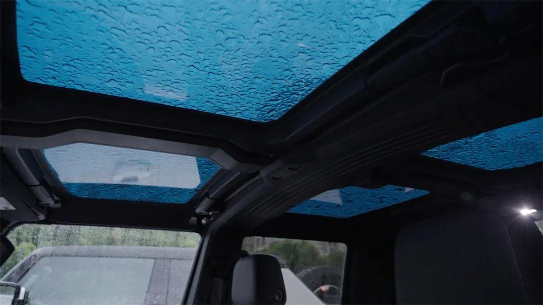 至于这块被称之为“无界车顶”的模块化天窗,和Jeep牧马人以及福特的BRONCO有哪些不同?这就跟HUMMER EV采用的纯电架构有很大关系了——可以将所有车顶收纳进前备厢,带着车顶去露营,而不是像牧马人那样拆下来需要放在家里。