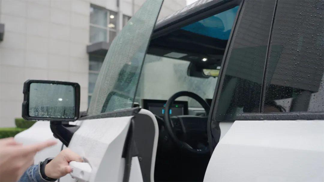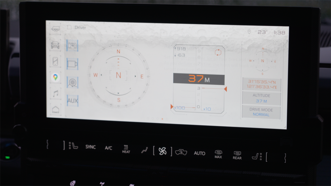在内饰材质上,并不是我们以为的高档皮革与各种缝线点缀,在很多地方比如门板、中控台都采用了偏硬的材质,包括表面也有磨砂质感的处理,主要还是为了越野后方便清理,打理起来更轻松,面对尘土和污泥也更耐脏。