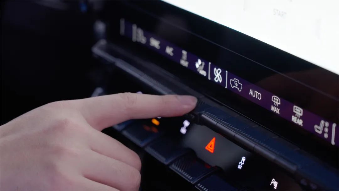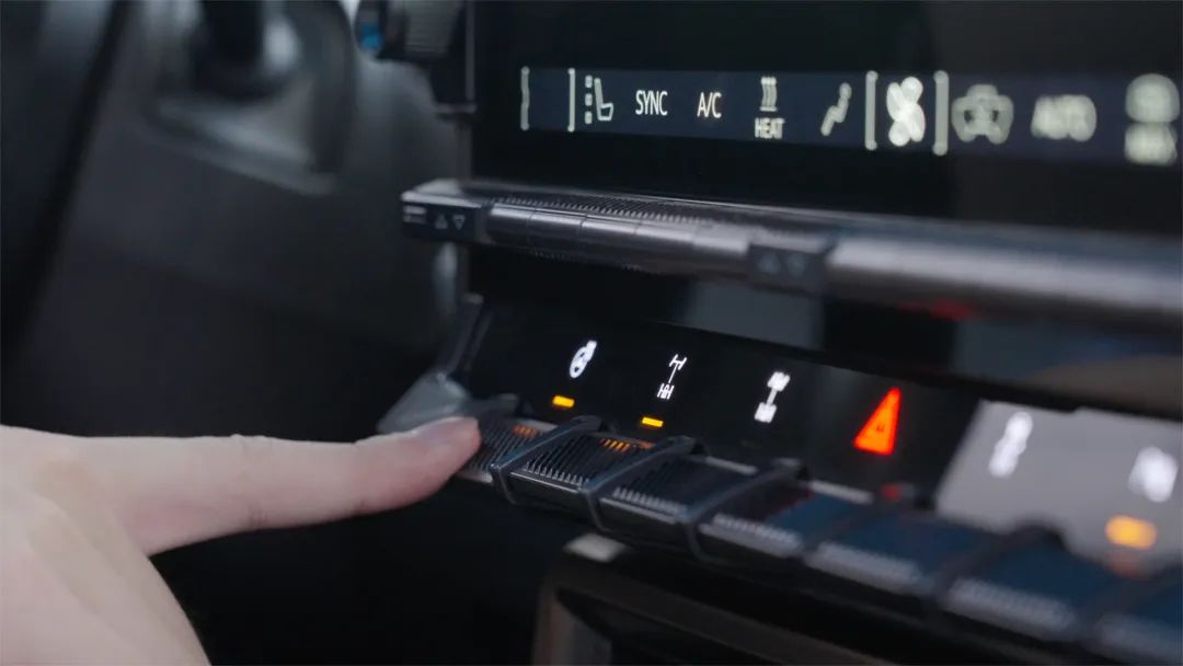 首先,HUMMER EV作为一台纯电越野皮卡,在户外越野场景就需要用到很多功能切换。所以中控屏幕下方的实体按键,也做得很大很醒目,冬天哪怕你带着手套也不会误触。并且,你也不会在越野的时候还有耐心去屏幕里面通过一级菜单、二级菜单去找各种功能开关。这些细节让HUMMER EV看着前卫、用着顺手。