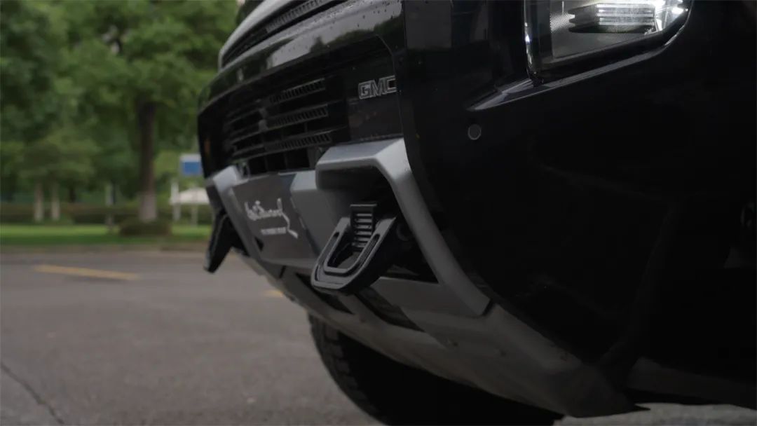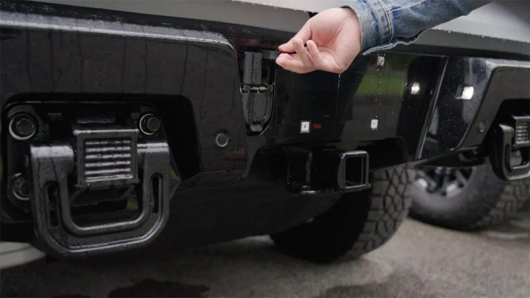 在看到实车之后,能够发现HUMMER EV整车的线条感和比例感有着明显的品牌传承,可以说就是一台经过现代设计语言“改良”的悍马H2 SUT皮卡版。除了6孔前脸和灯组,以及车顶的示宽灯之外,我最喜欢的设计还是两个拖车钩和保险杠下方的前护板,以前悍马H2在这里也会标明身份,从这些细节的确可以嗅出传承的味道。