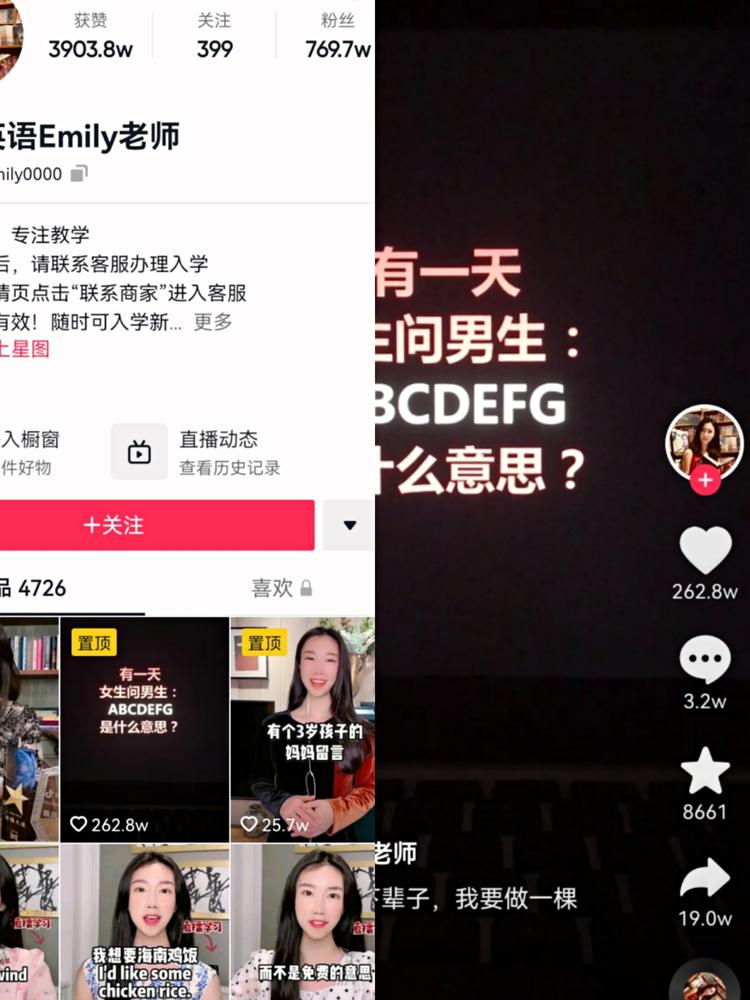 排在抖音第一名的英语教育类名师Emily,粉丝数量769.8W,其中最火爆的视频内容是:
