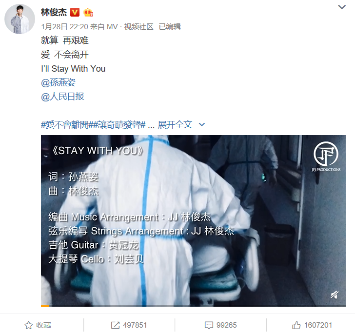 孙燕姿则说出了幕后故事:“几天前收到JJ的来电,他想写一首歌,致敬前线所有人员。Stay With You是我们一份心意。谢谢你们,辛苦了。”