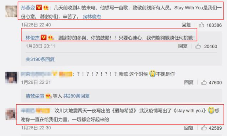 在网友留言中,还有人回忆起了汶川地震,“地震两天一夜写出的《爱与希望》 武汉疫情写出了《stay with you》感谢你一直在给我们力量,一切都会好起来的。”