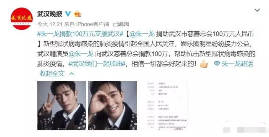 作为武汉人的朱一龙, 1月27日,朱一龙通过武汉市慈善总会捐赠100万。