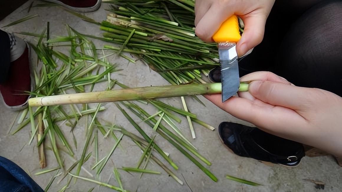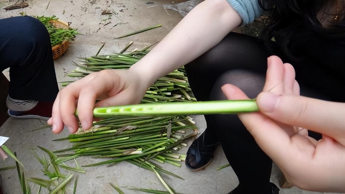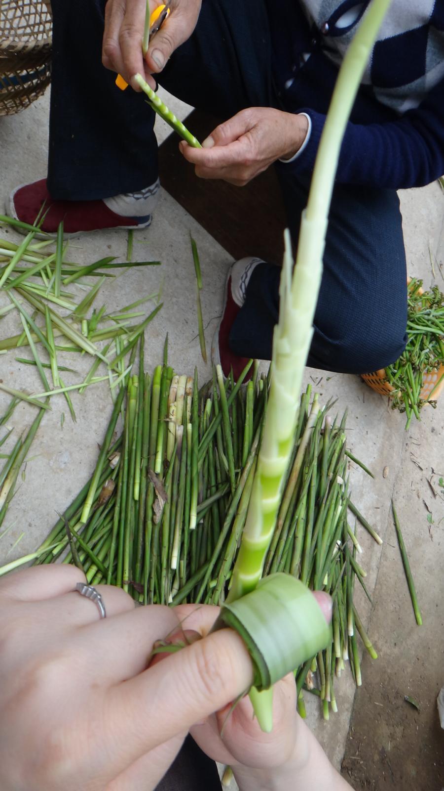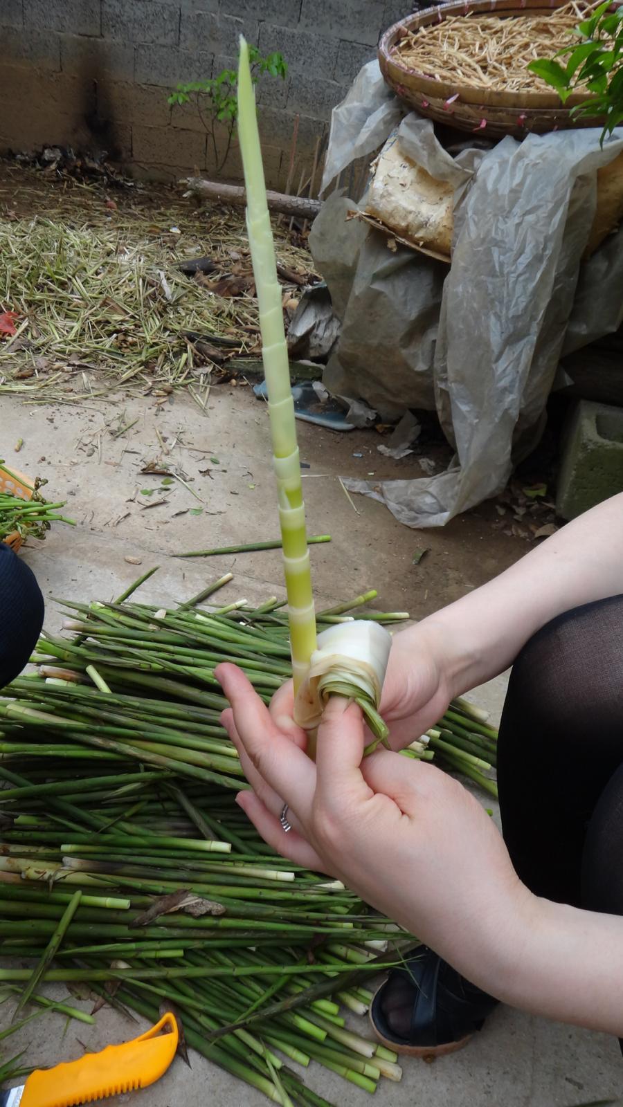 六.右手拿着笋,左手食指卷着笋尖剩下的笋衣。
